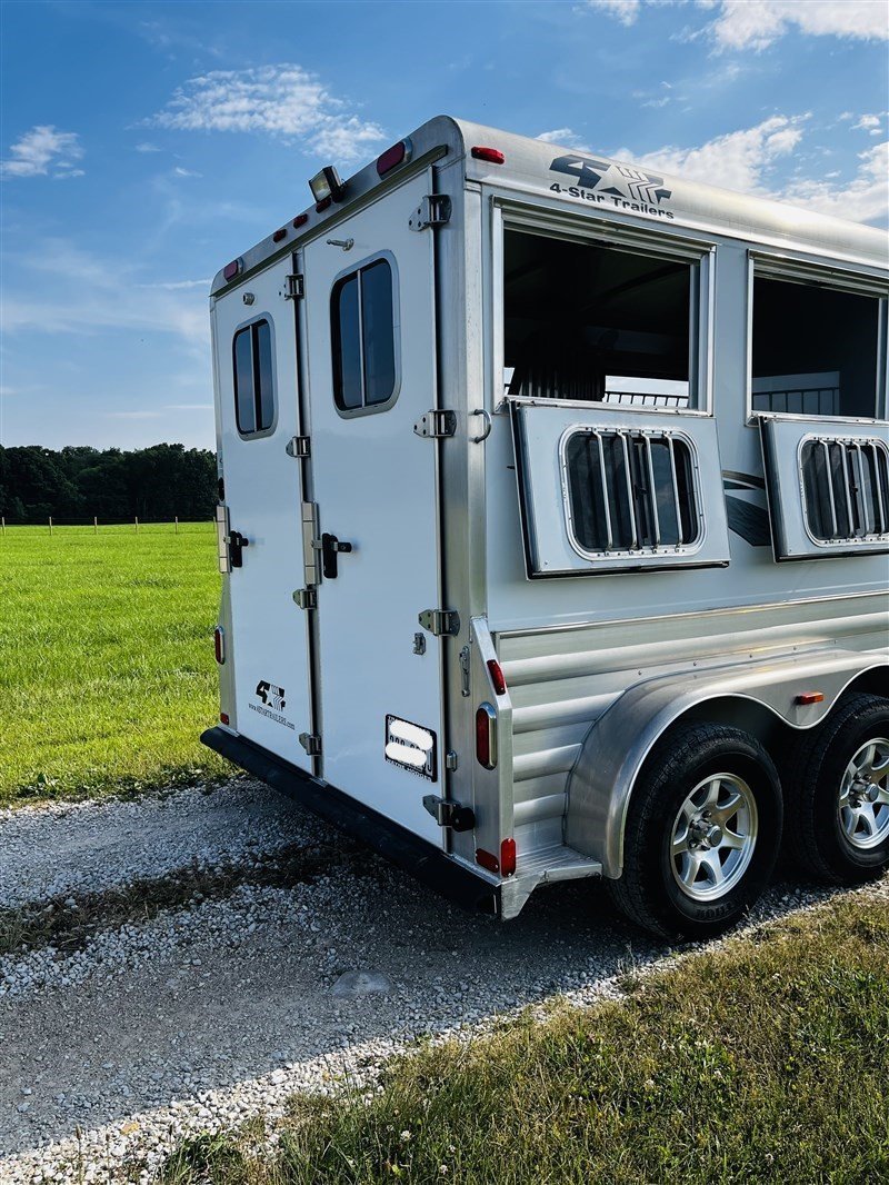 2015 4 Star 2 Horse Slant Load Bumper Pull Aluminum Construction 7′ Wide 11’6″ Length 7′ Tall 2 3500# Torsion axles w/electric brakes 15 x 6 Aluminum Wheels w/Spare Dropdown Windows with Bars on Head Side Dropdown Windows on Butt Side Padded Divider between horses 5 Dome Lights Pair of Extra Height Turn Signals 3 Halogen Load Lights Padded butt bar across rear opening (2) Pop-up two-way roof vents Inside and outside horse ties Gray Carpet on dressing room floor 2 Saddle racks in rear tack room 2 Blanket Bars (1 in the rear tack and 1 in the dressing room) 10 Bridle Hooks 2 Feed Bags 2 Brush Trays Heavy Duty rubber mats in horse area Locking door in dressing room In very good condition and well taken care of.