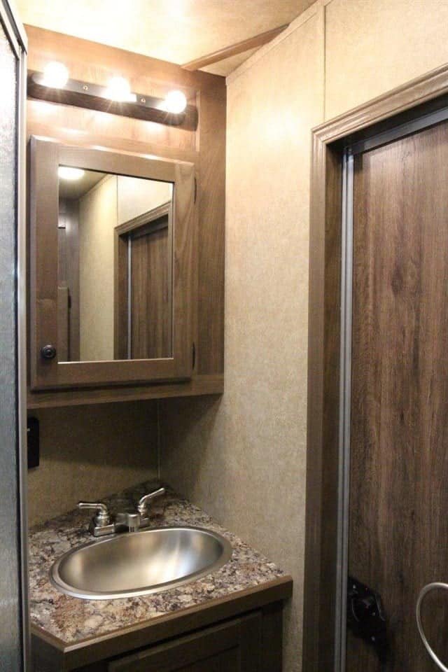 • The bathroom has a spacious shower, storage and a walk-through door to the mid tack.