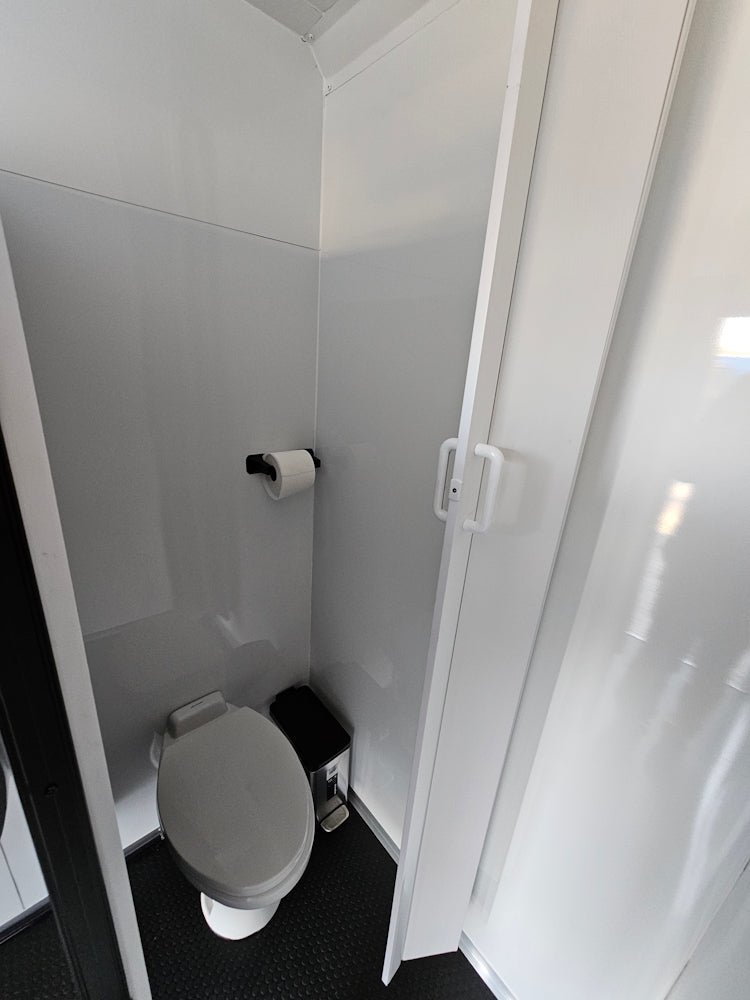 - Sophisticated Interiors: White aluminum walls with contrasting black aluminum stall dividers add a stylish touch.
