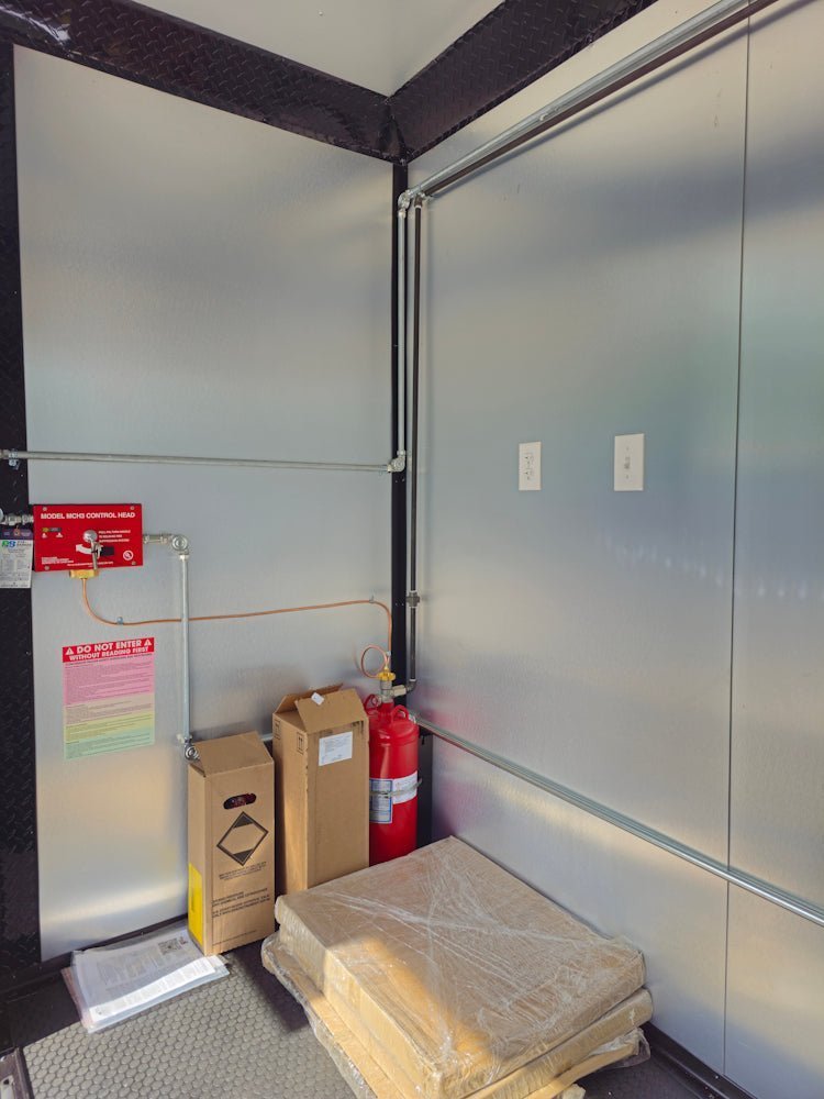 - Aluminum mill finish walls and ceiling on the cook side, paired with wood on the storage side, balance easy-clean surfaces with natural warmth.
