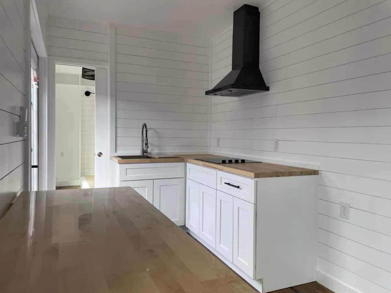 Qty 1 – 8 ft L-Shape Shaker Kitchen Base Cabinets with Sealed Butcher Block countertops, includes cabinet hardware