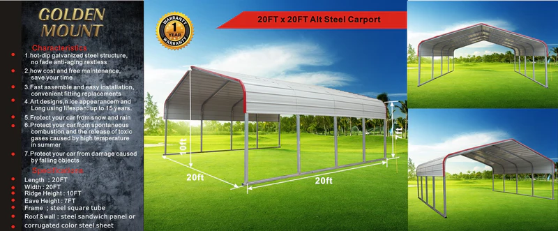 The Golden Mount Classic Steel Carport is a multi-purpose shelter for protecting your cars, boats, tractors, and other equipment. The carport is built to last, and it features a hot-dipped galvanized steel structure for corrosion resistance. The carport is easy to assemble and very sturdy. The high wind and snow load capability make the Golden Mount carport durable and stable, and the heavy-duty roof and frame are built to withstand tough weather conditions.
