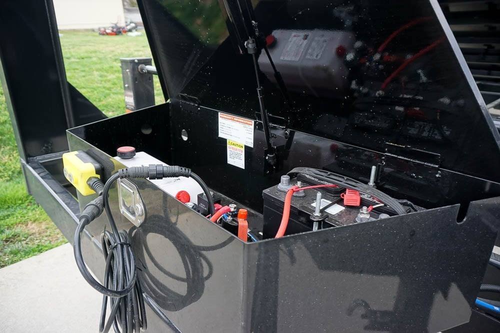 - The battery is an Interstate deep cycle marine battery, providing a dependable power supply for the trailer’s hydraulic system.