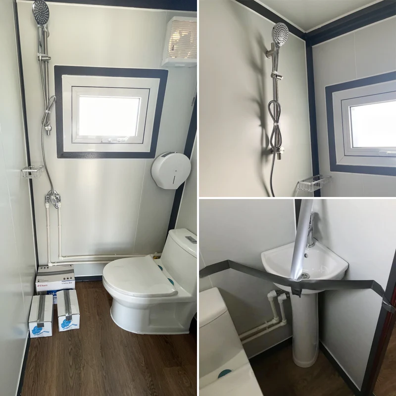 Mobile Prefab House is not wired. Please hire an electrician for American standard wiring. Stay safe! We recommend you connect toilets to the sanitary sewer system and connect water to the pipe system. If not, you may need tanks outside the structure for waste.